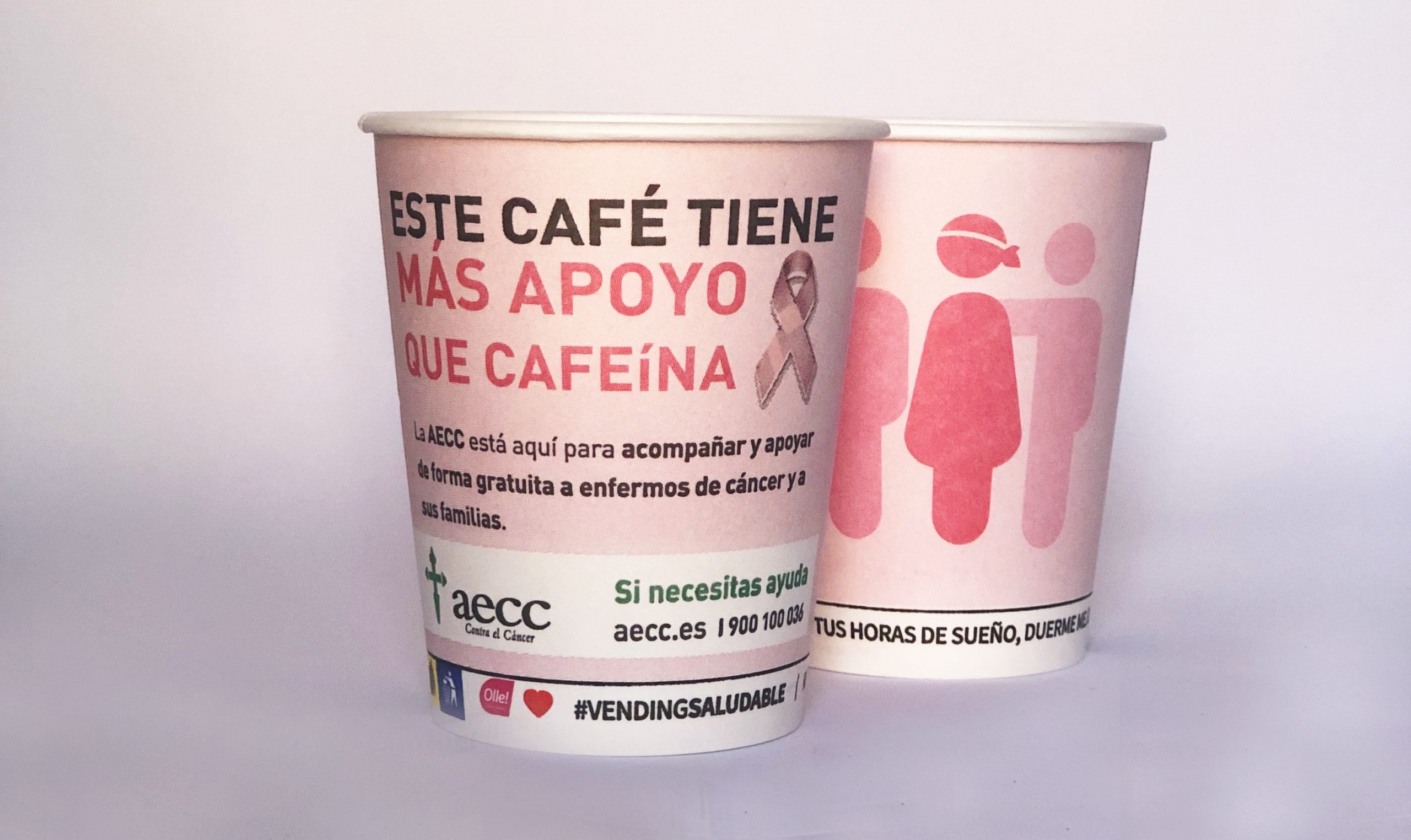 La empresa operadora de distribuidoras automáticas Alliance Vending lanzaba el pasado mes de septiembre una singular campaña de vasos de café con mensajes para concienciar y apoyar a la Asociación Española Contra el Cáncer (AECC). La iniciativa prevé alcanzar más de cinco millones de impactos directos en hospitales, universidades, grandes empresas y centros deportivos de toda España. Con el lema ‘Más apoyo que cafeína’, la campaña social desarrollada conjuntamente sirve como herramienta informativa sobre la labor de la AECC, que ayuda y acompaña a enfermos de cáncer y a sus familias.