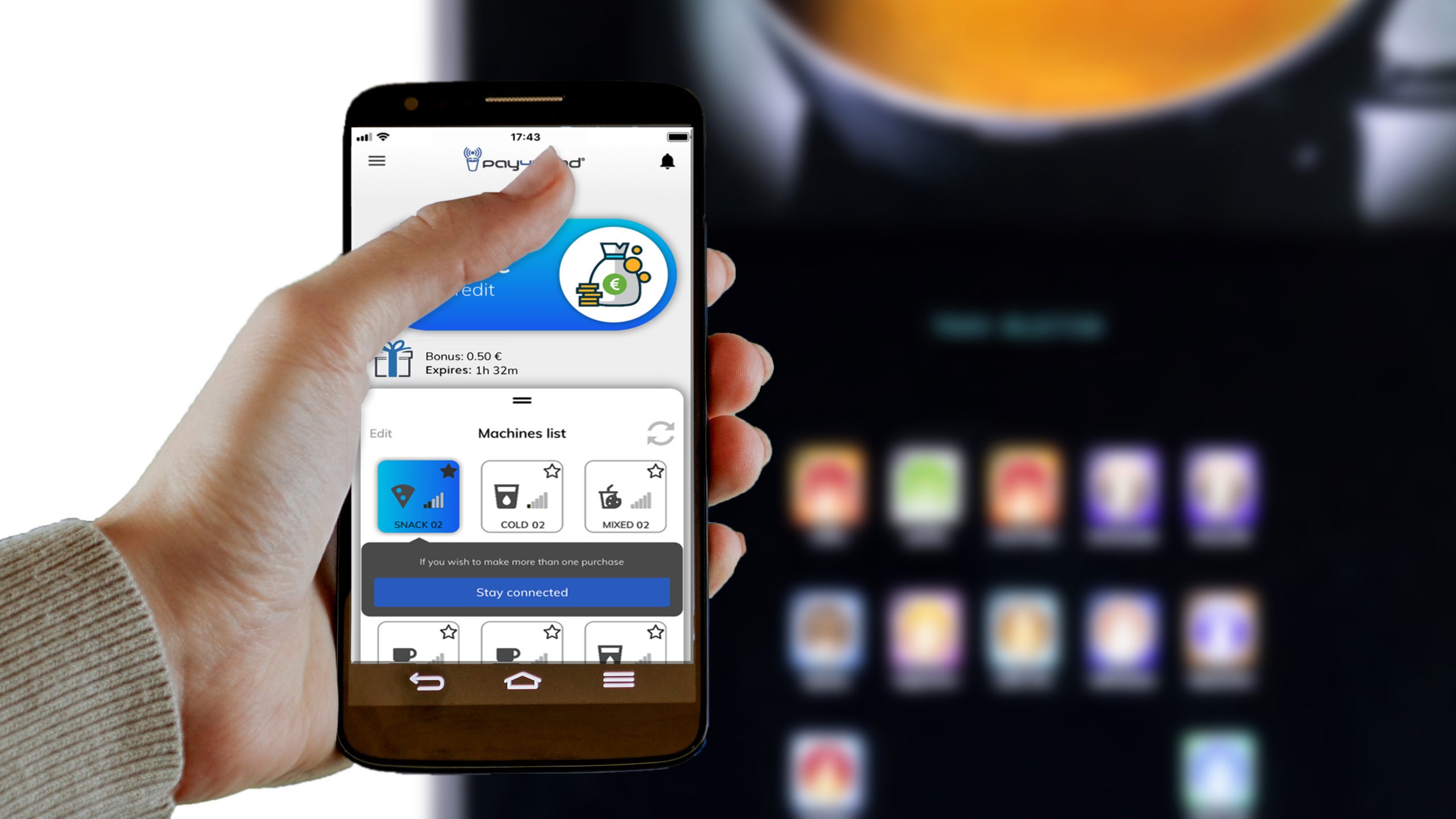 Más de 20 mil clientes de vending en Italia y otros países europeos recurren a Pay4Vend para adquirir todo lo que desean en las máquinas expendedoras, convirtiendo su pausa para el café en un momento de relax aun más agradable. La aplicación, disponible para smartphone iOS y Android, funciona con un monedero virtual que se memoriza en forma encriptada en el interior de la aplicación. De este modo el usuario puede recargar su crédito con efectivo directamente en la distribuidora automática o utilizar tarjetas de crédito, PayPal o Apple Pay.