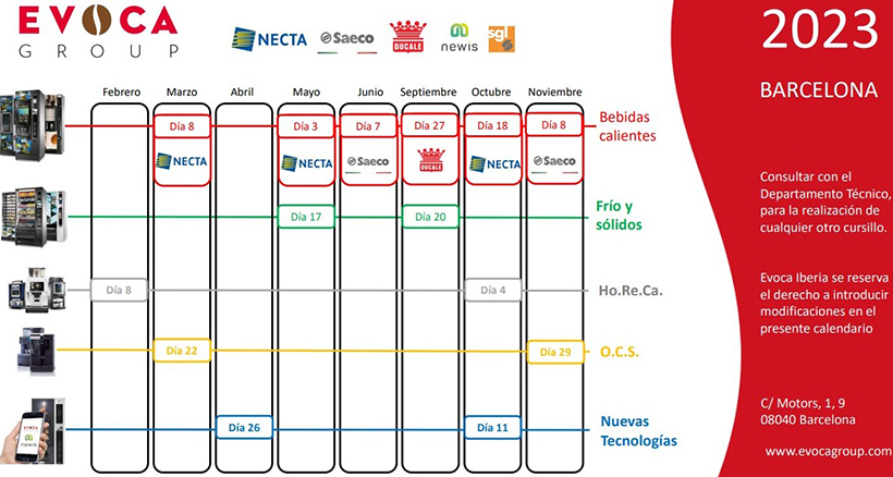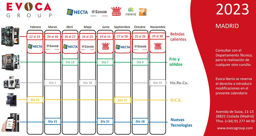 Con una visión clara de cuáles son los requerimientos de sus clientes, Grupo Evoca ha dado a conocer, un año más, los calendarios de formación técnica que impartirá el próximo año 2023 en sus instalaciones de Coslada (Madrid) y Barcelona.