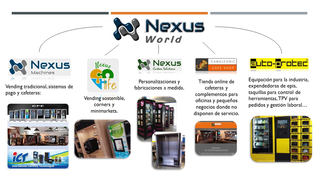 La capacidad de Nexus para adaptarse a las necesidades de mercado en cada momento lleva a la compañía a ofrecer soluciones a todo tipo de clientes, aunque sea a pequeña escala. Tanto es así que la trayectoria ascendente de la firma la lleva a ramificar su oferta en cinco divisiones distintas, las cuales forman el Nexus World: Nexus Machines, dedicada a la distribución de expendedoras de vending tradicional GPE, sistemas de pago ICT y cafeteras Carimali; Nexus Life, que ofrece soluciones en vending sostenible y sano, corners y minimarkets; Nexus Custom Solutions, enfocada a proyectos personalizados y a medida; Camaleonic Cafe Shop, su tienda online de cafeteras y café para oficinas y pequeños negocios; y finalmente, Auto-Protect, cuyo objetivo es ofrecer soluciones para la industria, desde expendedoras de epis hasta taquillas para suministro y control de herramientas y TPV para gestión laboral.