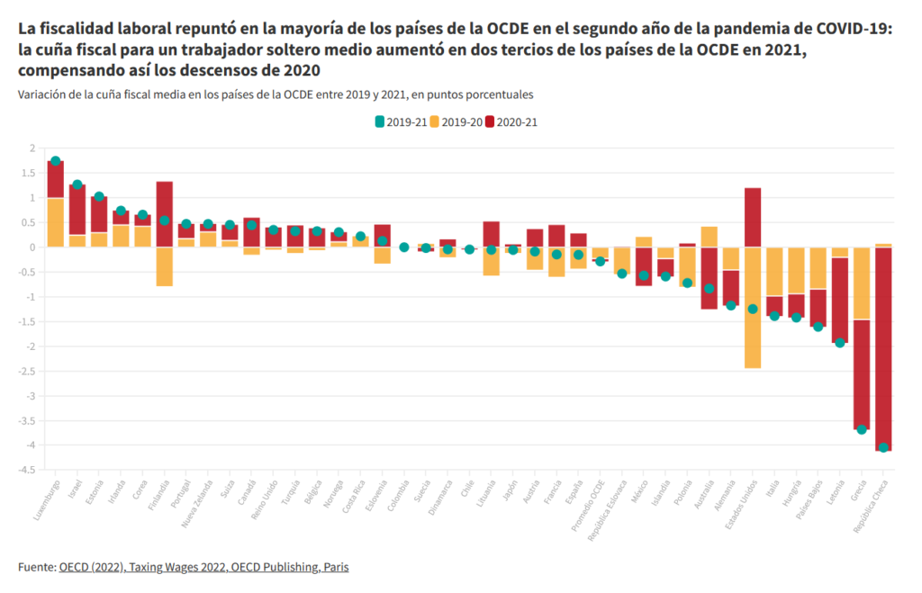 Entre 2020 y 2021, la cuña fiscal para los hogares formados por dos hijos y un único preceptor de ingresos que cobraba el salario medio aumentó en 27 países, disminuyó en 10 y se mantuvo sin cambios en uno. El aumento superó un punto porcentual en 10 países, siendo Lituania, Austria y Canadá donde se registraron mayores aumentos. Se observaron descensos de más de un punto porcentual en cinco países, siendo Chile donde fue más acusado (25,5 puntos porcentuales) debido al Ingreso Familiar de Emergencia, una medida temporal de apoyo para hacer frente al COVID-19.